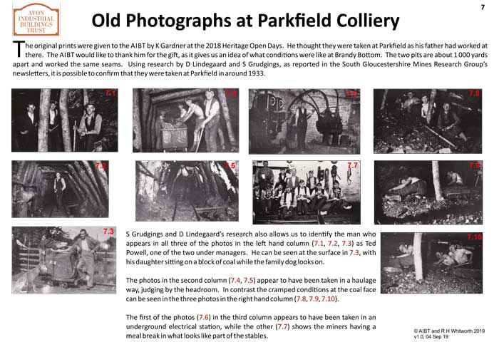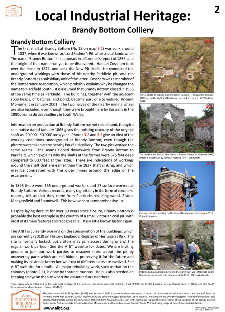 Local Industrial HeritageThe set of 4 A2-sized sheets on the local industrial heritage seen below were made made for display in the Lyde Green Community Associations community centre. They briefly cover: The Dramway; Brandy Bottom; Parkfield and Ram Hill Collieries; Shortwood Brickworks and Handel Cossham. They also carry the logos and brief notes about the AIBT, the Bristol Industrial Archaeological Society (BIAS) and the South Gloucestershire Mines Research Group (SGMRG). (Unlike the AIBT, both BIAS and the SGMRG have a programme of lectures and walks) A second set of 3 sheets has been produced for the AIBT. They are very similar, but without the one on Brandy Bottom, and are used during Heritage Open Days and at shows when the main Brandy Bottom sheets are also on display.