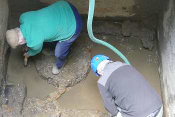 Pumping out water from the south-west end of the condenser pit of the Cornish Engine House, February 2020.