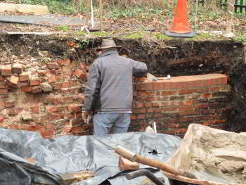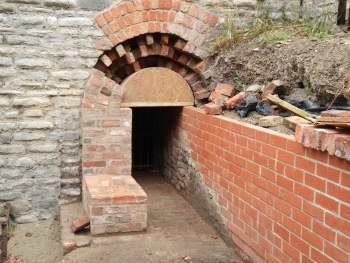 The brick arch at the end of the East flue in the process of being rebuilt in June 2020. The brick plinth on the left was the first part to be constructed.