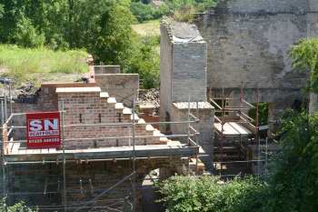 Rebuilding of south-east wall of Vertical Engine House in progress, February 2016. A photo taken in 1982 showed that there was a fireplace in the wall, hence its inclusion into the rebuilt wall. A later photo shows the finished wall.