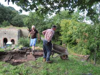 Clearing the vegetation from the outside of the Vertical Engine House, May 2011